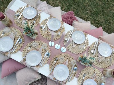 Picnic setups include tables, cushions, rugs, glassware/plates/cutlery, napkins, table décor/candles etc.